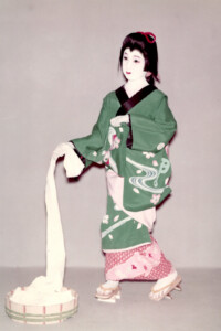 1間ほど離れたきなこの盆に投げ入れ、端から盆にのせたり竹の皮に包んだりするパフォーマンスをして人気だった